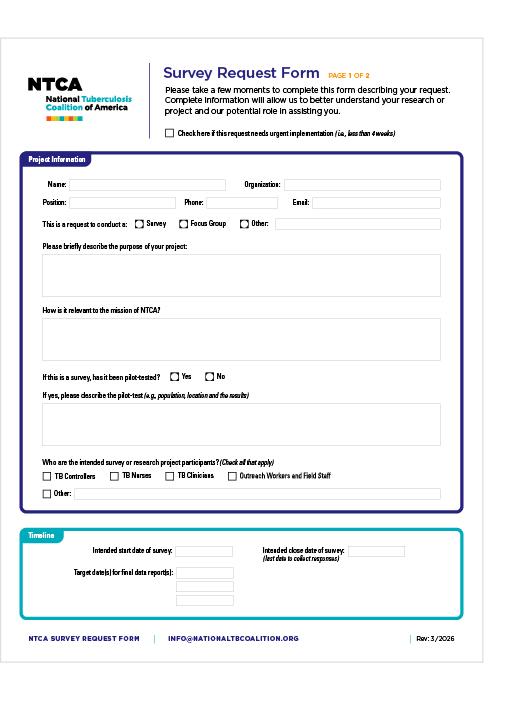Complete the Survey Request Form and send it to info@nationaltbcoalition.org.