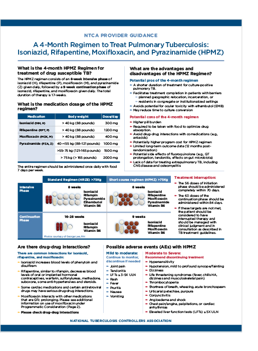 The National Society of TB Clinicians (NSTC) and National TB Nurse Coalition (NTNC) collaborated to develop A 4-Month Regimen to Treat Pulmonary Tuberculosis: Isoniazid, Rifapentine, Moxifloxacin, and Pyrazinamide (HPMZ). This two-page fact sheet and companion FAQ are intended to give guidance for providers on using the 4-month HMPZ regimen to treat patients for pulmonary TB disease.
